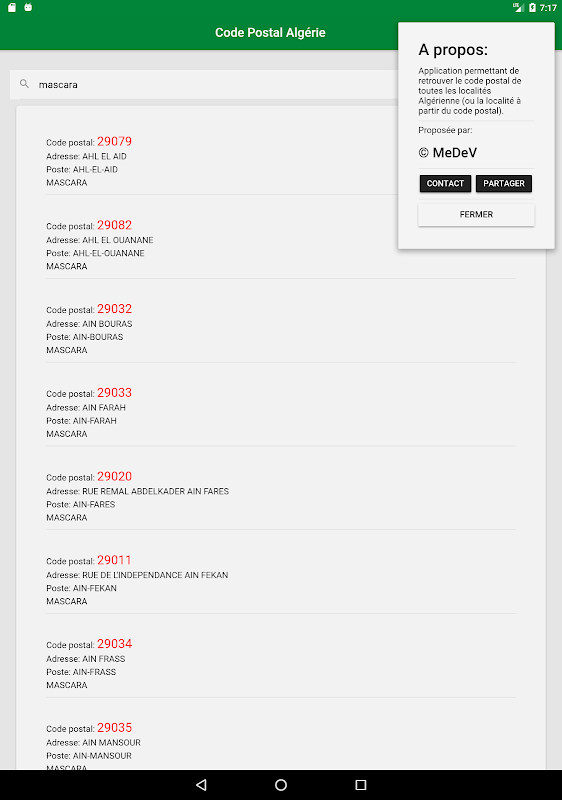 This app makes it possible to find the zip code by entering the address of a locality, a commune, a city or a wilaya throughout Algeria or inversely (find the address by entering the zip code ..)
