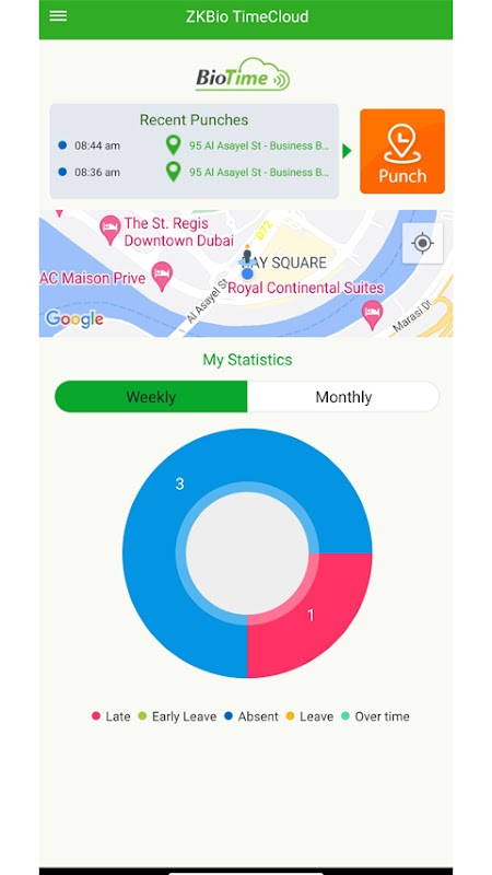 ZKBio TimeCloud is a real-time attendance mobile application connected to the cloud-based time attendance software - BioTimeCloud. Its features included clocking in with geographic location details, raising and approval of employee requests, announcements, reports, and online notifications. Administrator and employee levels can be configured from the webserver.