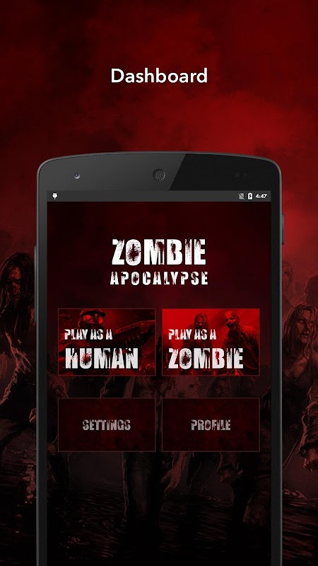 Humans run for dear life, build your armory, and terminate the zombies. Zombies gather your armies, find and infect humans by getting within a few feet of them, and take over the world.