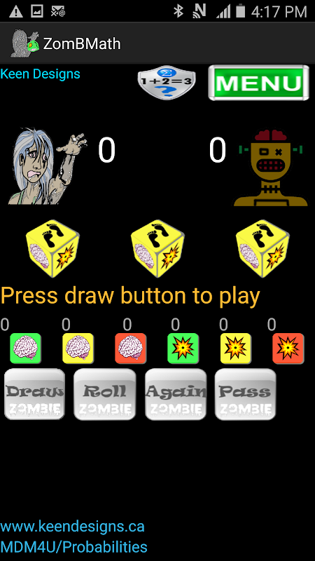 This is a full zombies math game version of dice probabilities. A player can choose to play against a robot zombie, or with another player. Players are racing to score 13 brains and playing in turn. Options for sound effects or changing racing score to win are provided. During a turn, a player draws and rolls 3 dice at a time, and keeps scores of brains and blasts. A player could keep on drawing and rolling dice and accumulate brains scores as long as the blast tally is less than 3, or the player will lose the brains tally and the turn. The player can also stop at any time during the turn to secure the scores. Player could also score bonus points or steal points from opponent by answering mathematical probability challenges (MDM4U level) correctly. Basic probability theories needed for the challenges are outlined in the info section.