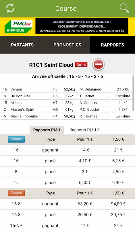 - Arrival and PMU reports of Tiercé, Quarté, Quinté, 2 out of 4, Multi, Pick 5 and single game