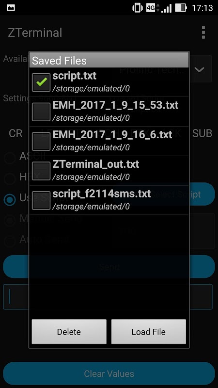 Z Terminal also supports usage of script files in text format. Users can automatically send commands to the device connected to their Android device serially and quickly implement field applications with a Script text file which contains the appropriate configuration and command lines for the specific application.